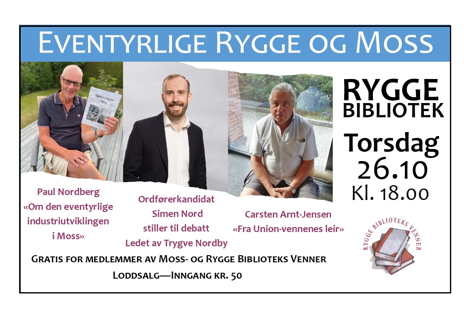 Inngang kr 50. Gratis for medlemmer av Moss- og Rygge biblioteks venner.